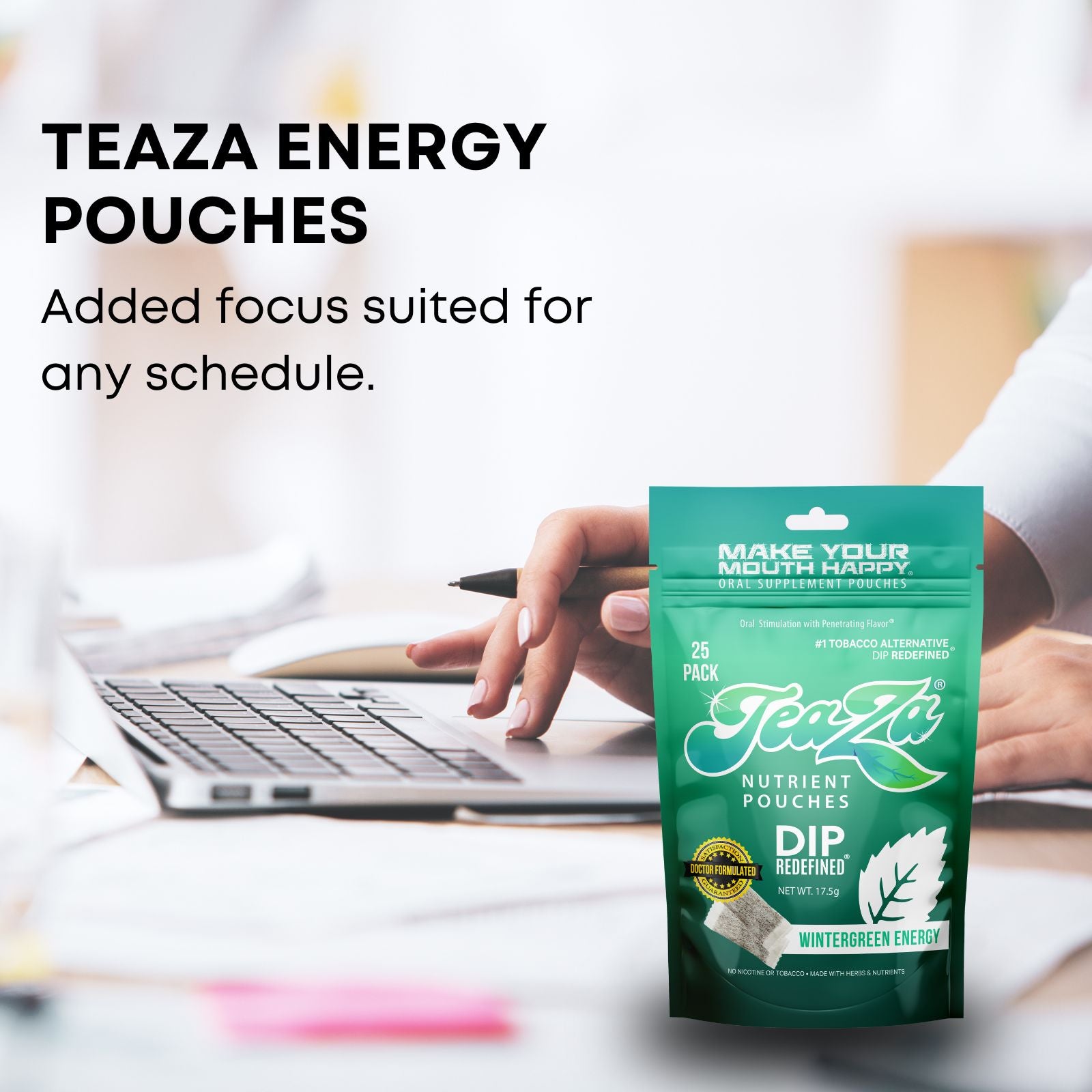 Power through your day with the crisp, clean taste of Wintergreen Energy—TeaZa’s invigorating, nicotine-free pouch designed to deliver a smooth caffeine boost and curb cravings naturally. Infused with green tea, yerba mate, and a refreshing burst of wintergreen flavor, each pouch provides 50mg of caffeine to help you stay sharp, focused, and energized—without the crash of energy drinks or the harmful effects of tobacco.